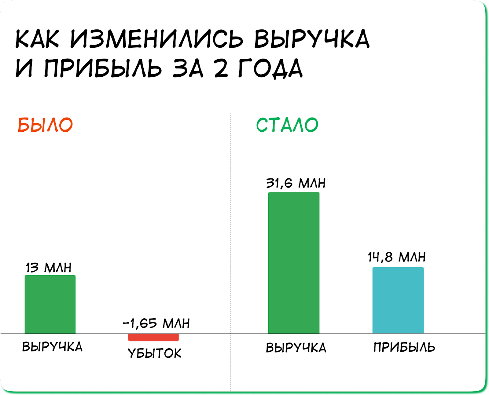 Увеличили выручку и прибыль. За два года увеличили выручку в 2,5 раза, а прибыль в 14. Сфокусировались на планировании: сколько нужно договоров, чтобы у компании была работа и деньги.