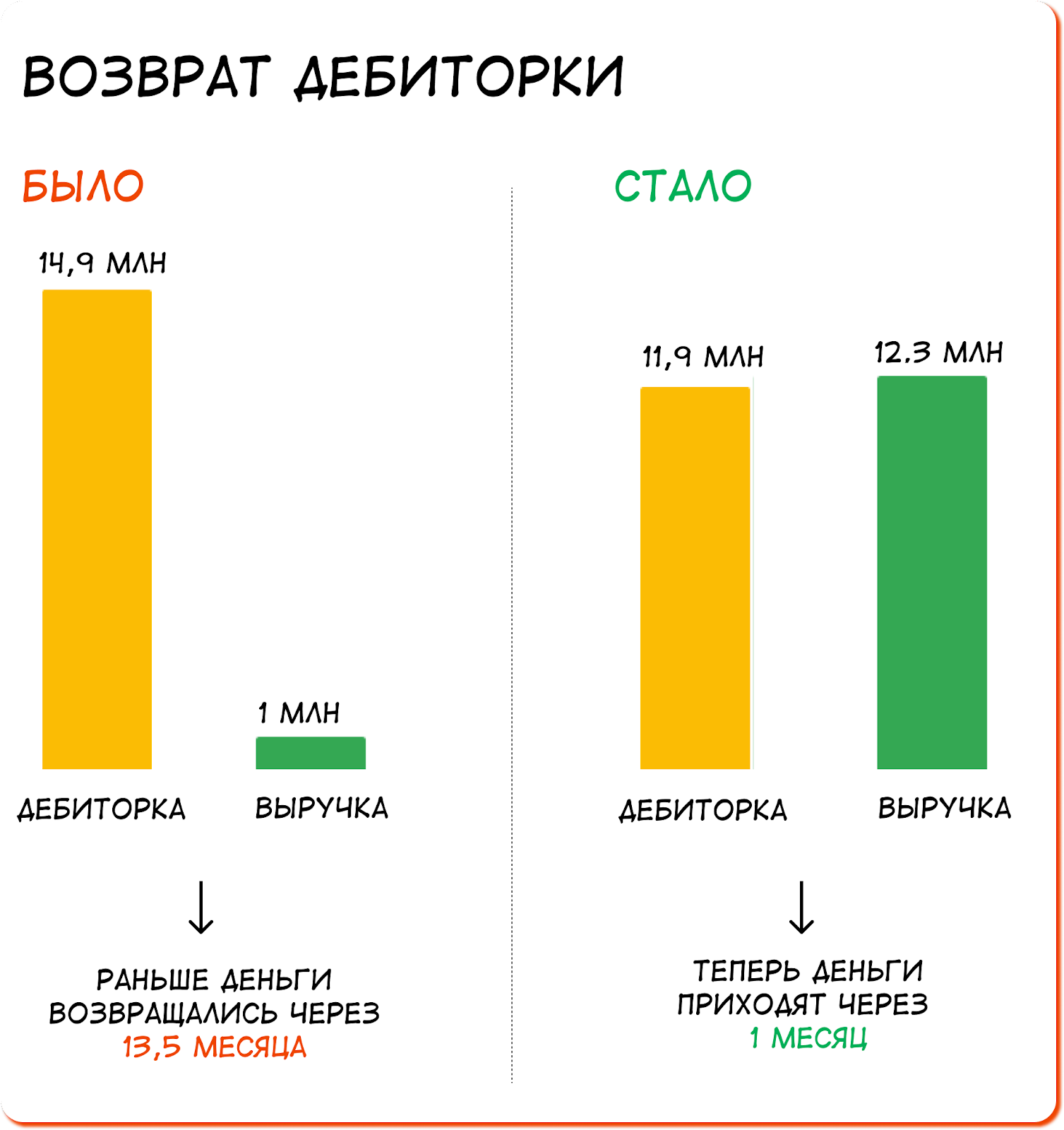 Что получилось: срок возврата дебиторки сократили с 415 дней до 35. То есть пришли к расчетам не только по договору, но и по факту. В «Строймонтаж» начали прибывать деньги.