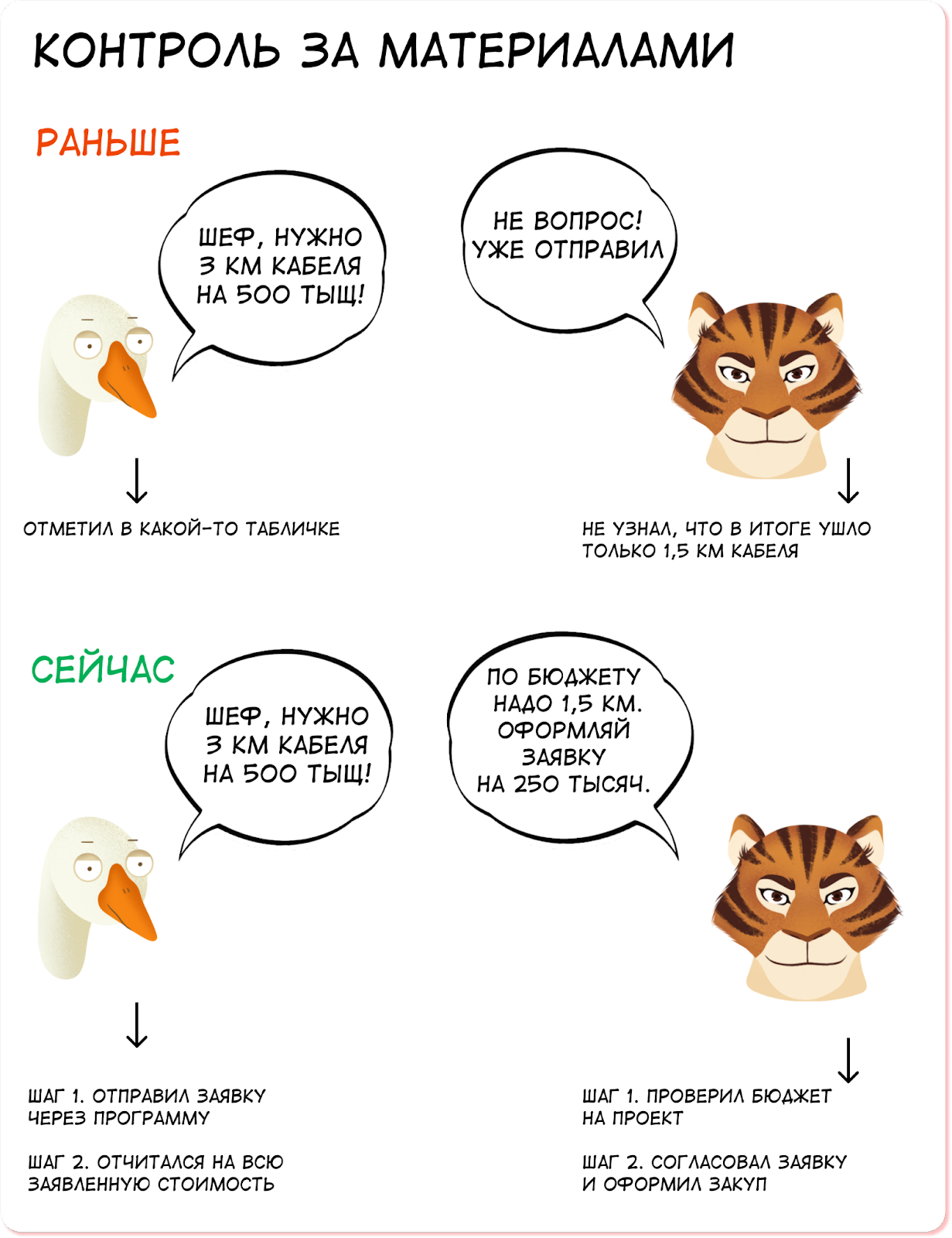 ❌ Бесконтрольные и необоснованные закупки материалов. Компания закупала материалы хаотично по заявке мастера, при этом никто не сверялся, на какие работы они пойдут. Получалось, что деньги потратили, а материалы лежат на складе без дела.