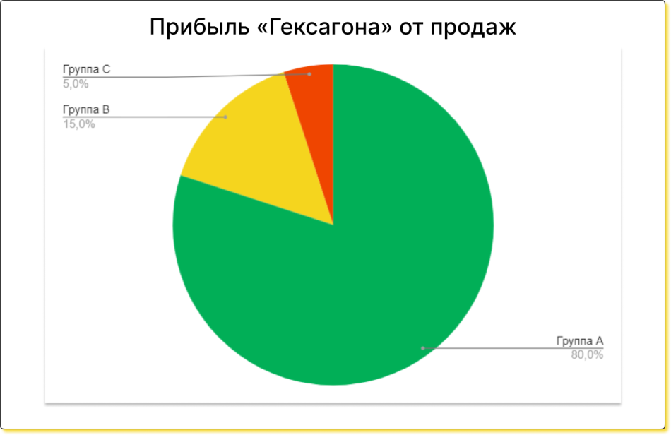 Дальше провели ABC-анализ — это анализ, который показывает, какие 20% товаров приносят бизнесу 80% прибыли. Для анализа разбили товары на три группы: