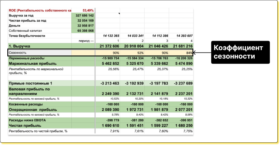 Коэффициент сезонности вносят в финмодель, чтобы бизнес мог прогнозировать выручку с учетом спадов и роста спроса. Для этого финдир: