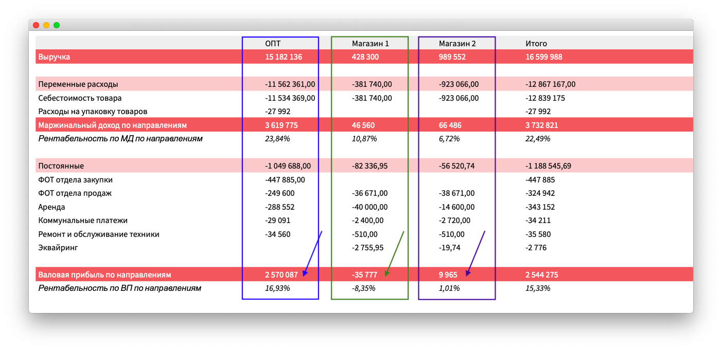 Собрали ОПиУ по направлениям: опт — отдельно, магазины — отдельно