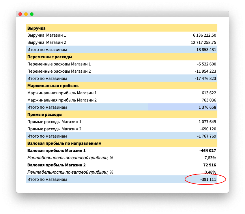 Данные собирались в одну табличку, поэтому было сложно определить, что происходит с магазинами, сколько прибыли они приносят и сколько убытков генерят. В отчете это выглядело примерно так: