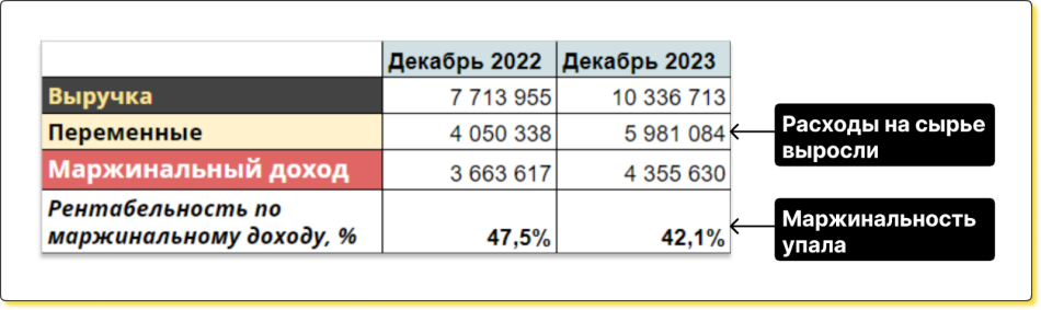 Когда финдир собрал ОПиУ, то увидел: маржа и рентабельность по маржинальной прибыли падают. Так происходит, потому что: