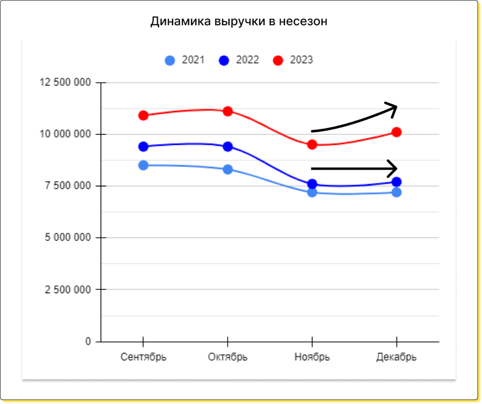 Увеличение чека помогло выровнять сезонность — зимой шаурму покупают реже, но бизнес смог отработать декабрь выгоднее, чем обычно. Вот данные за три года ↓