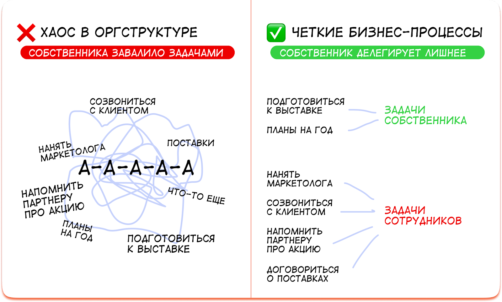 - Следить за собой: не позволять случаю или команде втягивать себя обратно в текучку. Четко следовать принципу «все операционные задачи — делегирую».