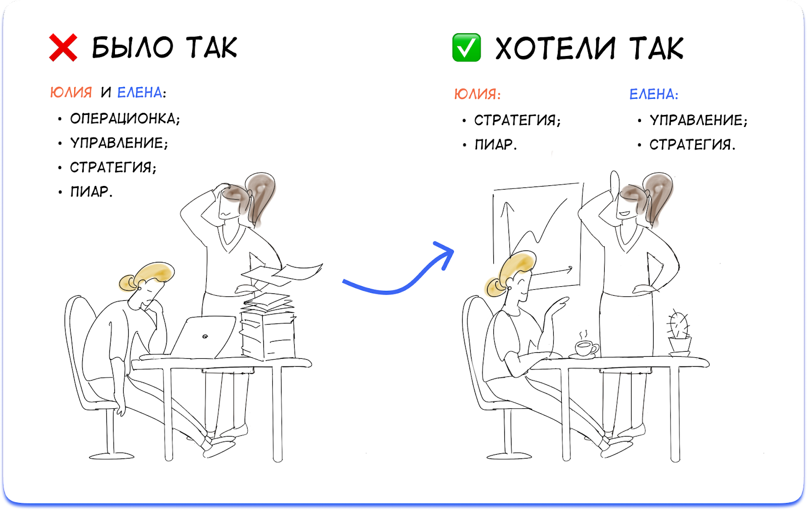 Мы выяснили, в какой роли находилась каждая собственница. По сути, они были менеджерами всего по чуть-чуть: Елена отвечала за несколько отделов, а Юлия занималась и клиентскими вопросами, и стратегией, и управлением.