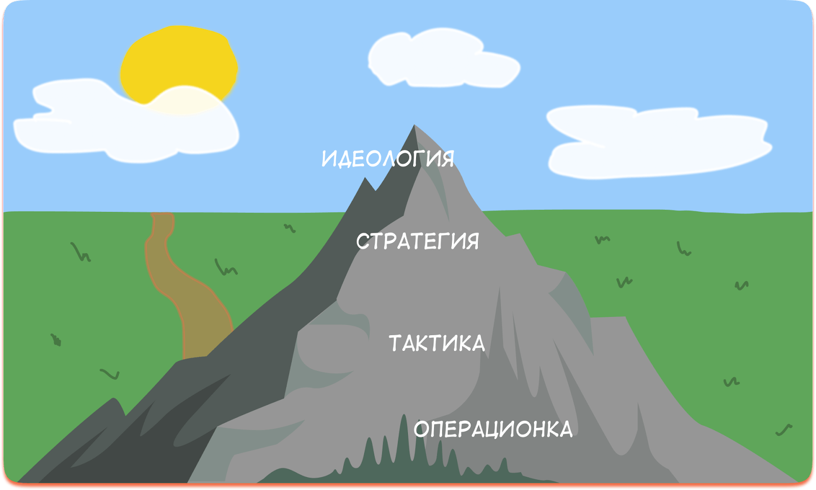 Визуально уровни можно представить как гору, где операционка — это основание, а идеология — вершина. С позиции операционки можно разглядеть только текущие задачи и цели, а вот с высот стратегии и идеологии уже видно общую картину бизнеса и всё, что его окружает.