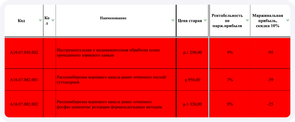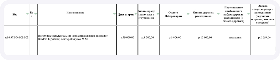 Добавили в себестоимость другие расходы по манипуляциям (заработную плату докторов, стоимость зуботехнических работ) ↓