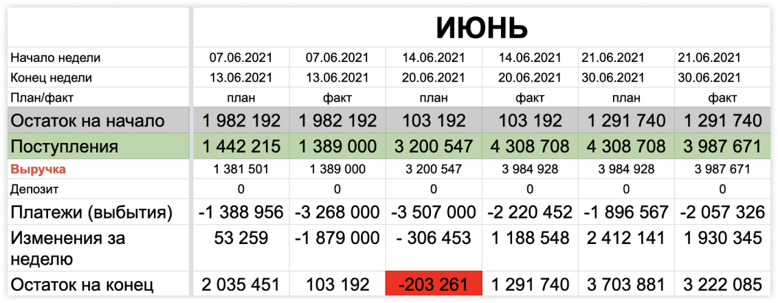 На скриншоте видно, что с 7 по 13 июня у нас критически мало денег на остатке, а с 14 по 20 июня вообще кассовый разрыв. Тогда о каких дивидендах может идти речь? Естественно, мы сначала пытались урегулировать ситуацию, например, договаривались об отсрочках с поставщиками, ждали, пока все урегулируется, и только потом собственник выводил деньги.
