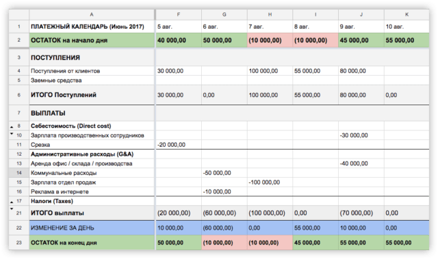 4. Платежный календарь. Инструмент для планирования денежного потока. Мы заносим сюда поступления и траты на месяц вперед — и можем заранее предусмотреть все так, чтобы не было кассового разрыва.