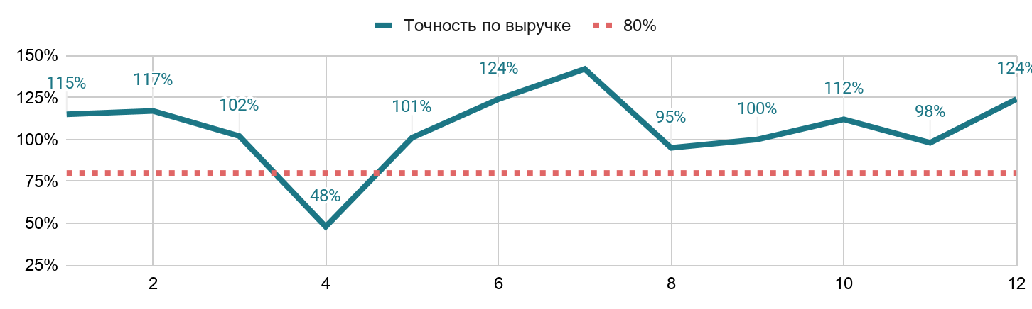 Но на деле планирование доходов с самого начала пошло как по маслу: мы держались в диапазоне 95-125% выполнения плана. Исключения были только два раза: