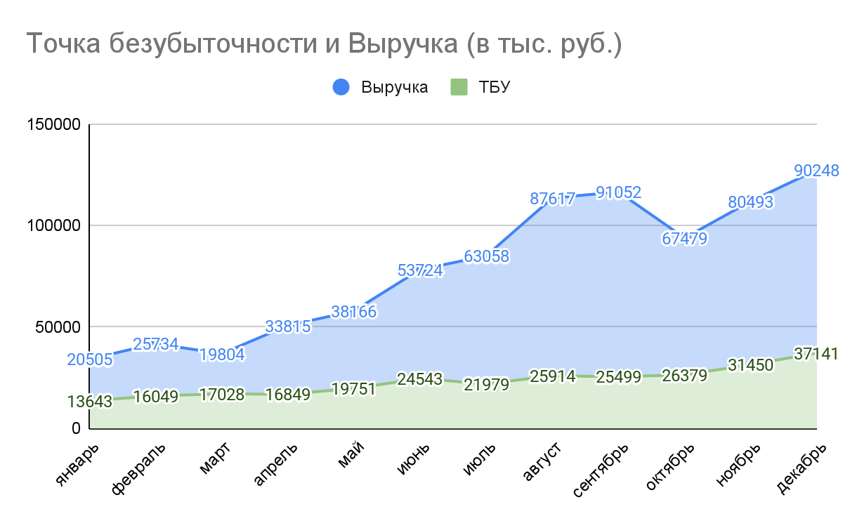 Точку безубыточности (ТБУ) и то, насколько высок запас финансовой прочности (ЗФП). Поясним, что показатели выручки и ЗФП связаны: с кратным ростом выручки постоянные расходы растут значительно медленнее, что увеличивает запас прочности компании.