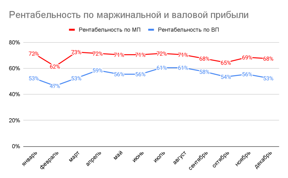 Отсутствие значительных отклонений на графике рентабельности по маржинальной и валовой прибыли. Ради красной линии на этом графике как раз и важно правильно рассчитывать себестоимость.