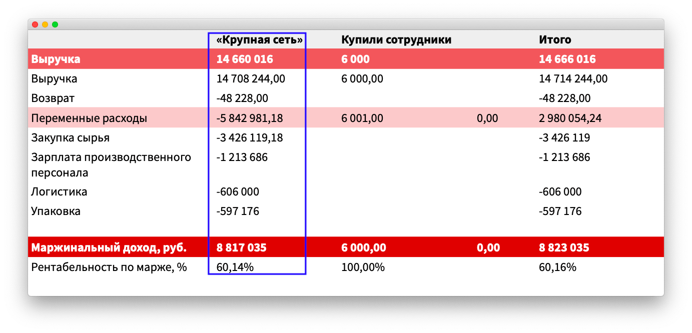 И всё было бы хорошо, но если посмотреть детализацию за апрель, можно увидеть, что всю выручку компания получила от единственного покупателя — крупной сети супермаркетов: