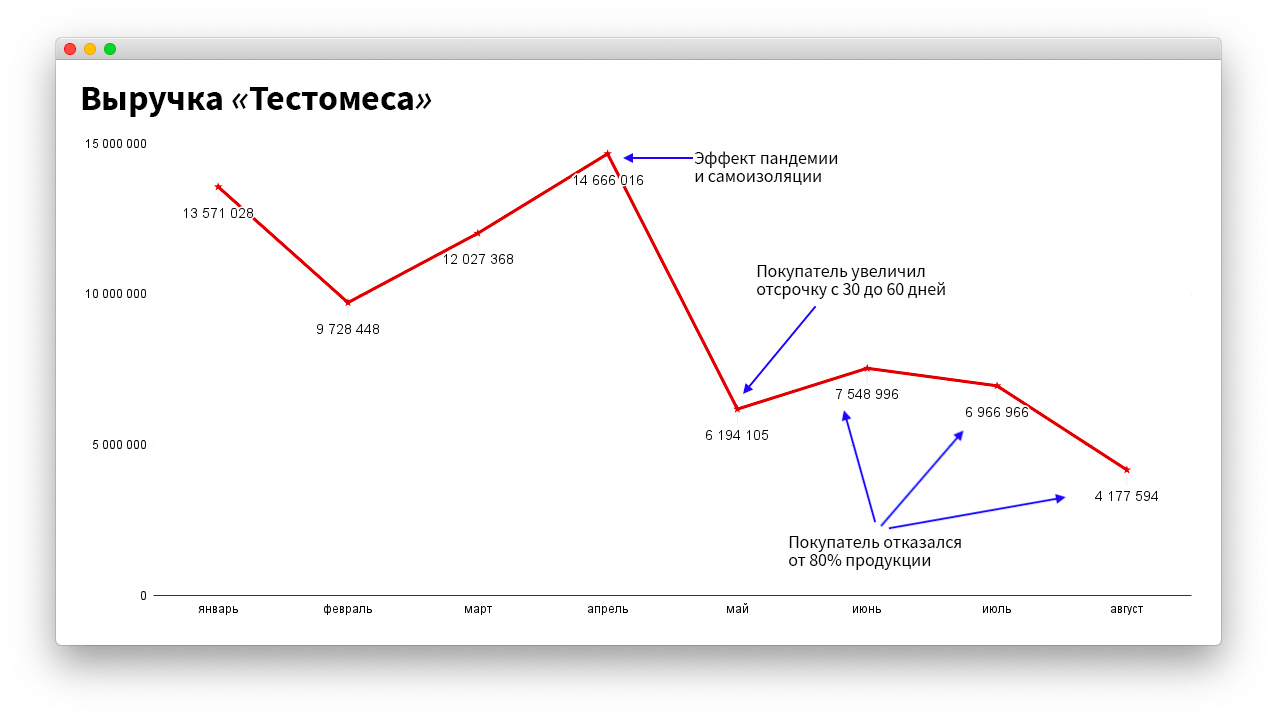 Итак, после рекордной выручки в апреле единственный покупатель «Тестомеса» увеличивает отсрочку в два раза, а затем отказывается от 80% закупок, ссылаясь на недостаточно высокое качество и плохие отзывы. Выручка компании падает сначала в два, а потом и в три раза, денег не хватает, и приходится залезать в долги.