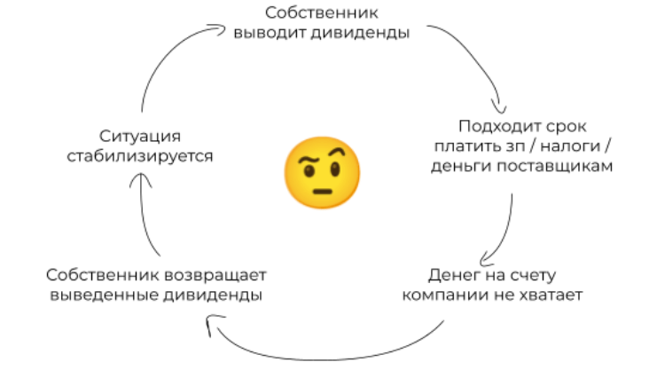 Из-за завышенной прибыли собственник думал, что всё супер, и выводил дивиденды. Но на самом деле всё было не супер, поэтому компания и попадала в кассовые разрывы. Работало это так: