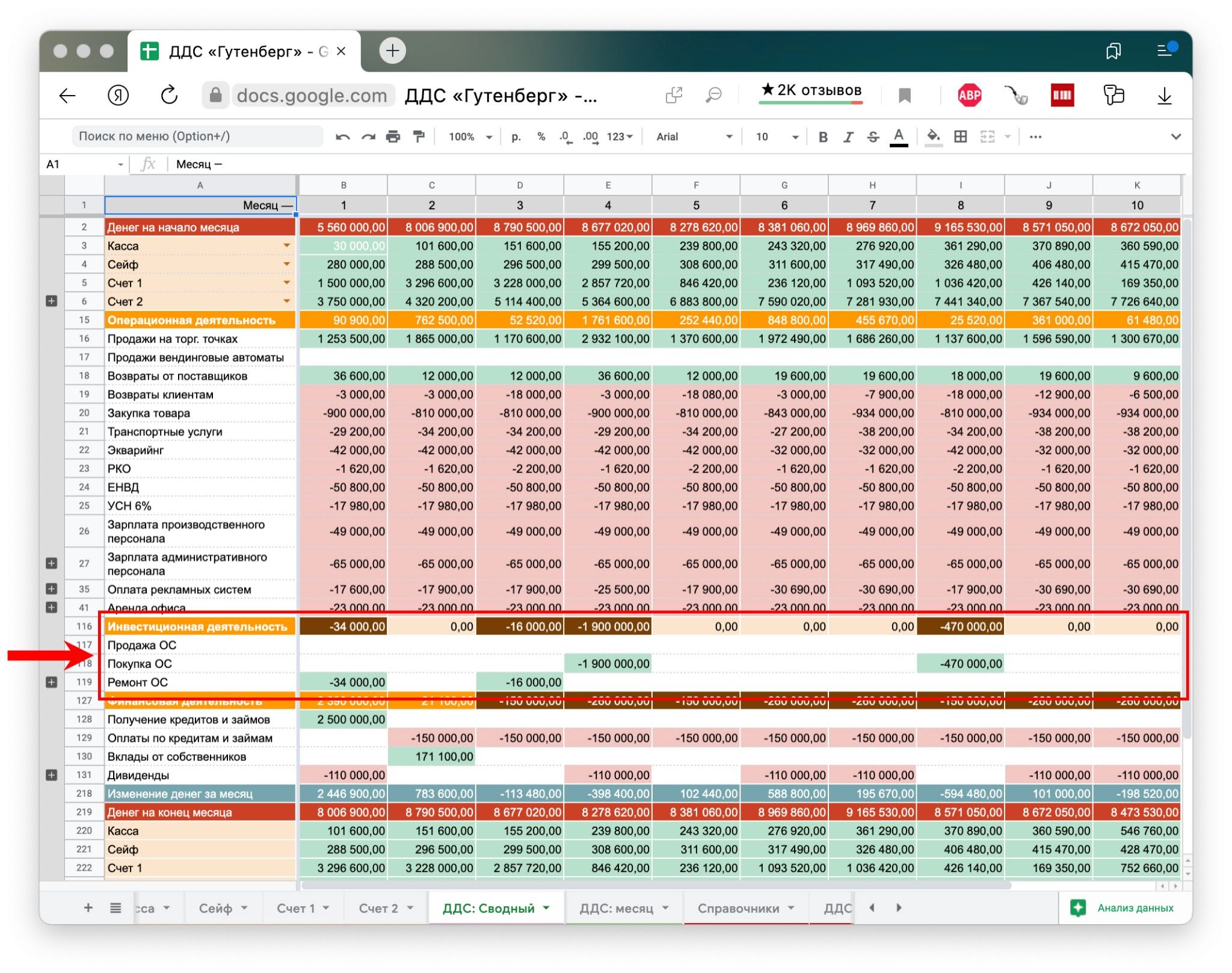 Чтобы разобраться, я разбила денежный поток на три по видам деятельности: операционной, финансовой и инвестиционной. И увидела, что проблема в финансовом потоке.