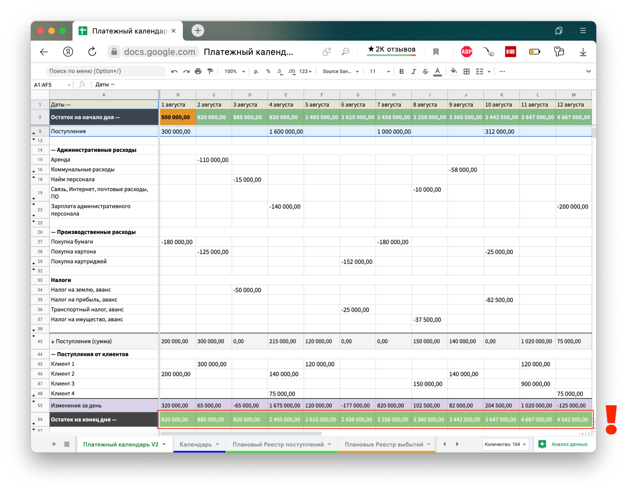 Теперь все затраты компании распланированы: собственник знает, когда рассчитываться за сырье, когда выплачивать зарплаты, когда гасить кредит. Все поступления тоже распланированы, и компания заранее видит угрозу кассового разрыва и может что-то предпринимать.