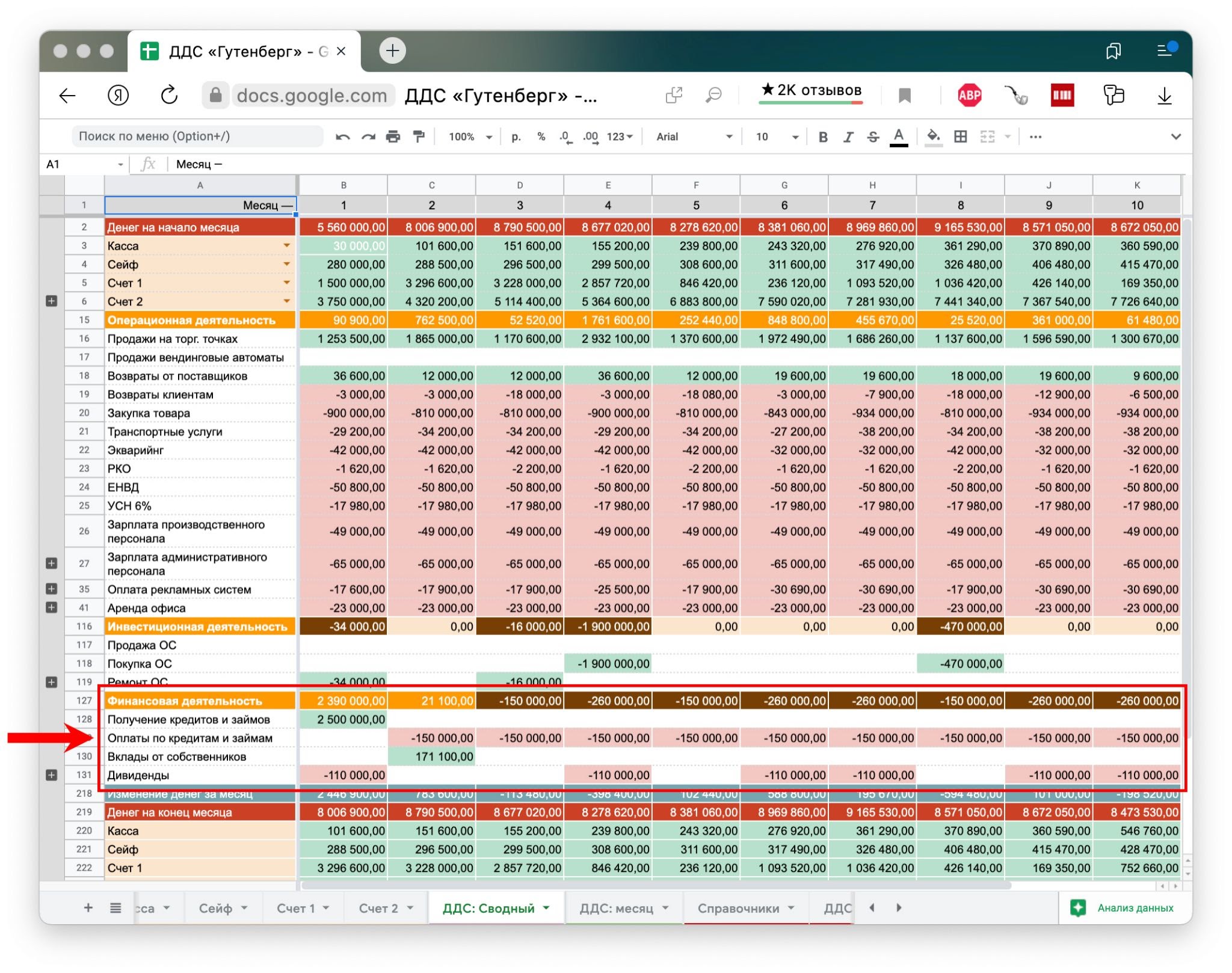 Поток от финансовой деятельности — это поступления и выбытия, связанные с займами, кредитами, выплатой дивидендов и вкладом собственника. Например, сюда попадают кредиты, которые берет «Гутенберг», и дивиденды, которые выплачивают собственнику. Именно кредиты и дивиденды загоняли компанию в кассовые разрывы: