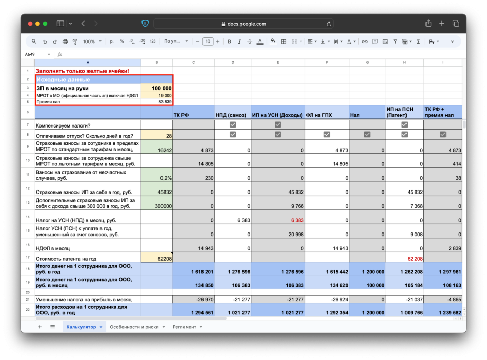 Навскидку сложно сказать, какой вариант занятости лучше, потому что везде нужно соотносить финансовую сторону и юридические риски. И чтобы соотнести, мы придумали калькулятор. Честно скажем, это что-то божественное: