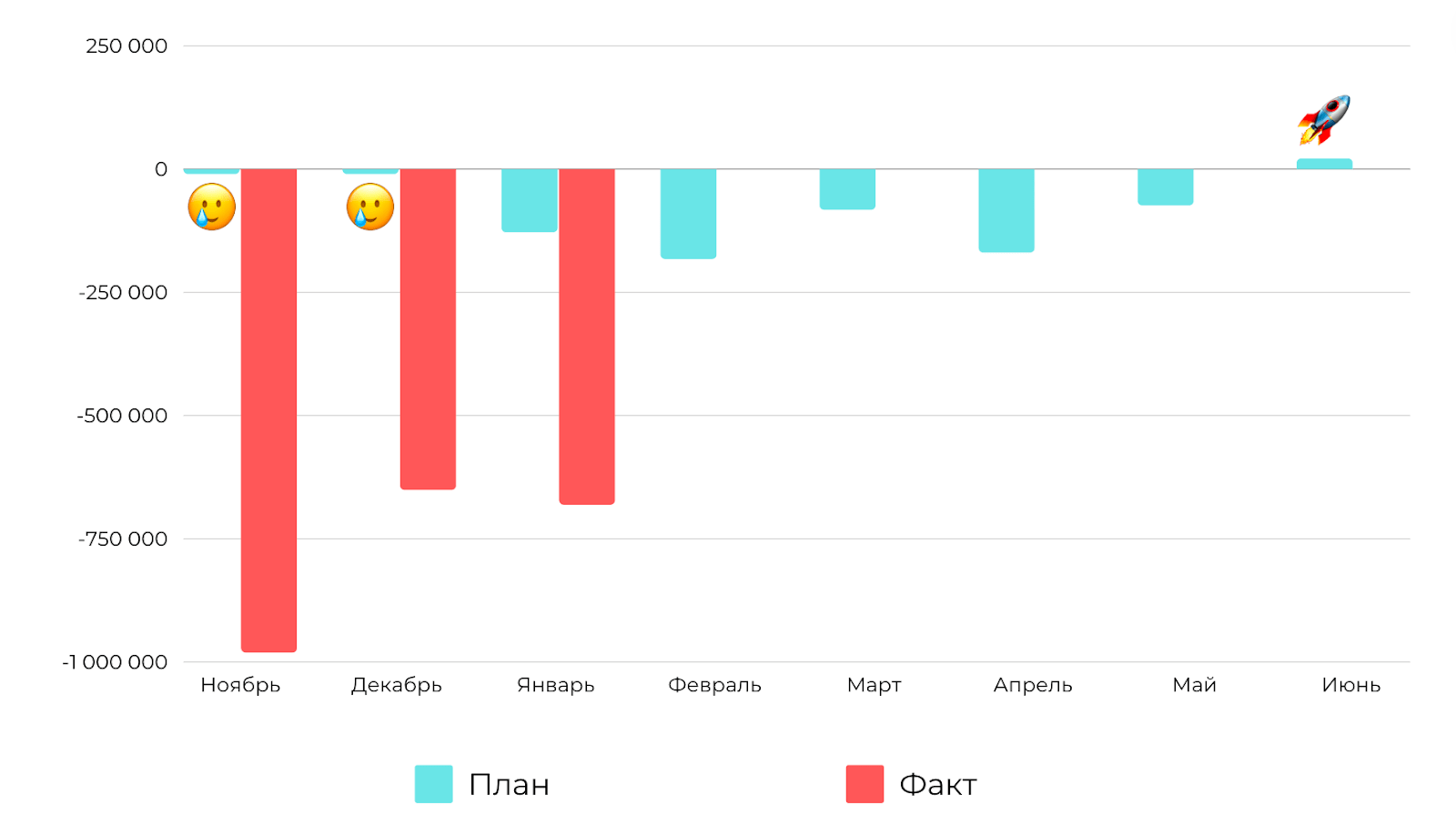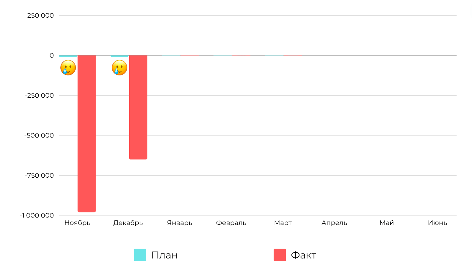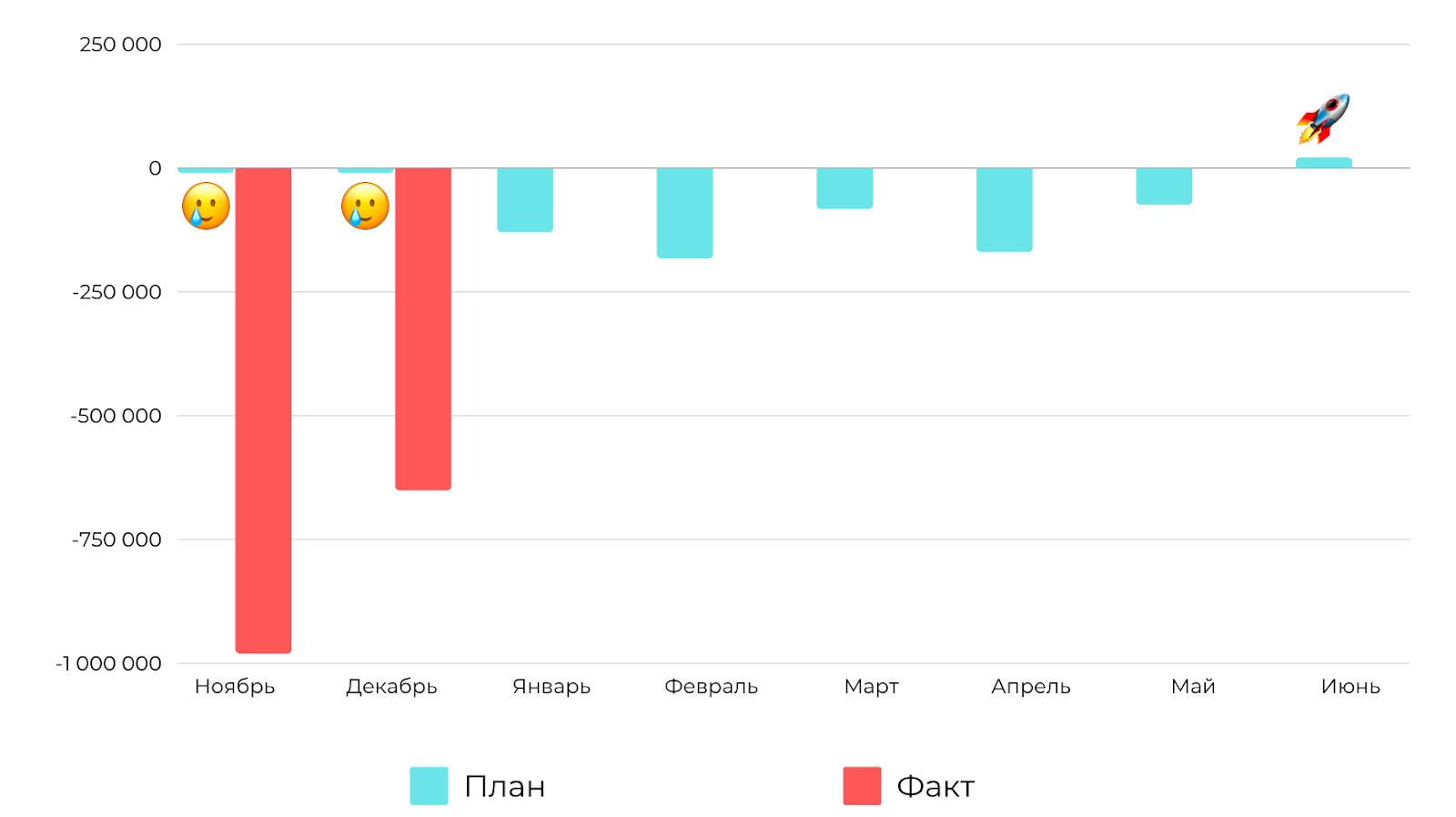 В итоге в январе мы ушли в минус еще больше, чем в декабре. Убыток увеличился на 680 000 рублей, хотя должен был только на 128 000. Остановились мы на отметке –2,3 млн общего убытка.