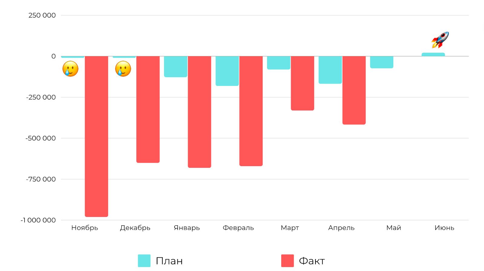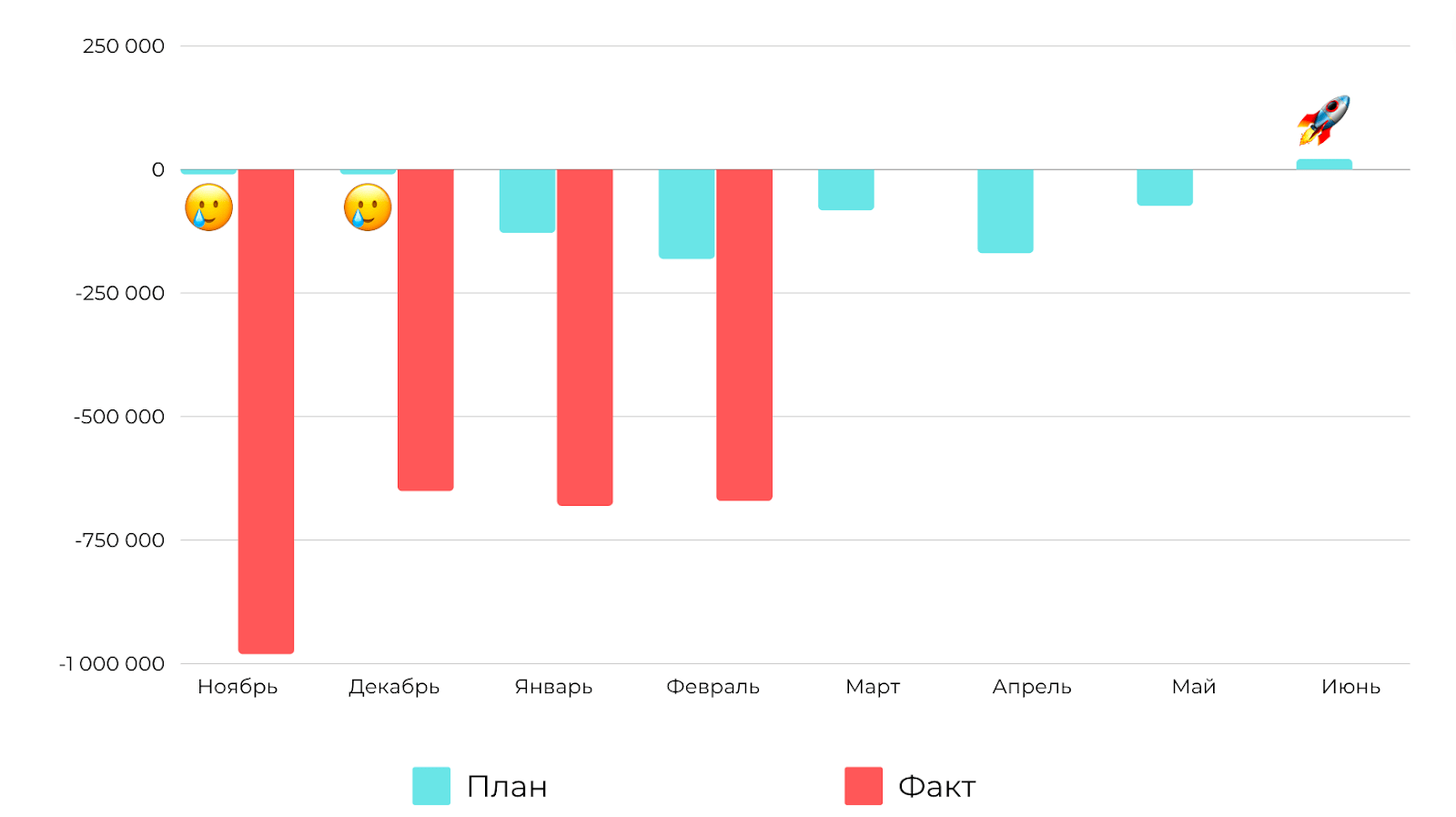 Продолжать работать в минус не хотелось, и мы составили план. По нему убытки должны были закончиться уже в мае. Начиная с июня, мы бы работали в плюс, а потом открыли вторую точку и масштабировали бизнес: