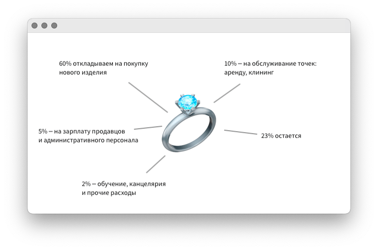 1. Все эти годы он занижал итоговую маржинальную прибыль. Дело в специфике рынка — украшения могут лежать на витрине долго, а их себестоимость все это время будет расти. И получалось, что если собственник приобрел кольцо за 70 тысяч рублей, прошло два года и он продал его за 150, но в каталоге у производителя такое уже стоит 100 тысяч, он считал, что его маржа — 50 тысяч, а не 80.