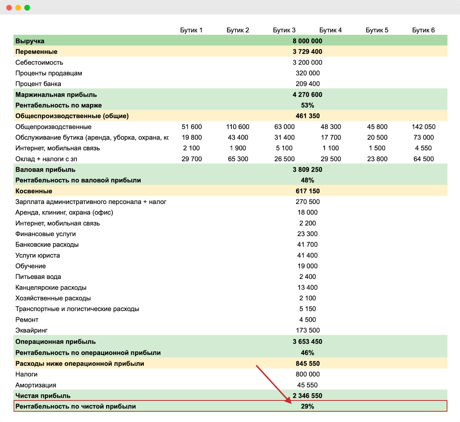 Но можно было еще лучше: ОПиУ показал три неприбыльных магазина из девяти – собственник без колебаний их закрыл. Затем оптимизировали расходы, немного подняли цены и в итоге вышли на рентабельность по чистой прибыли около 30% в обычные месяцы и 33-35% в прибыльные. Теперь наш ОПиУ выглядит примерно так: