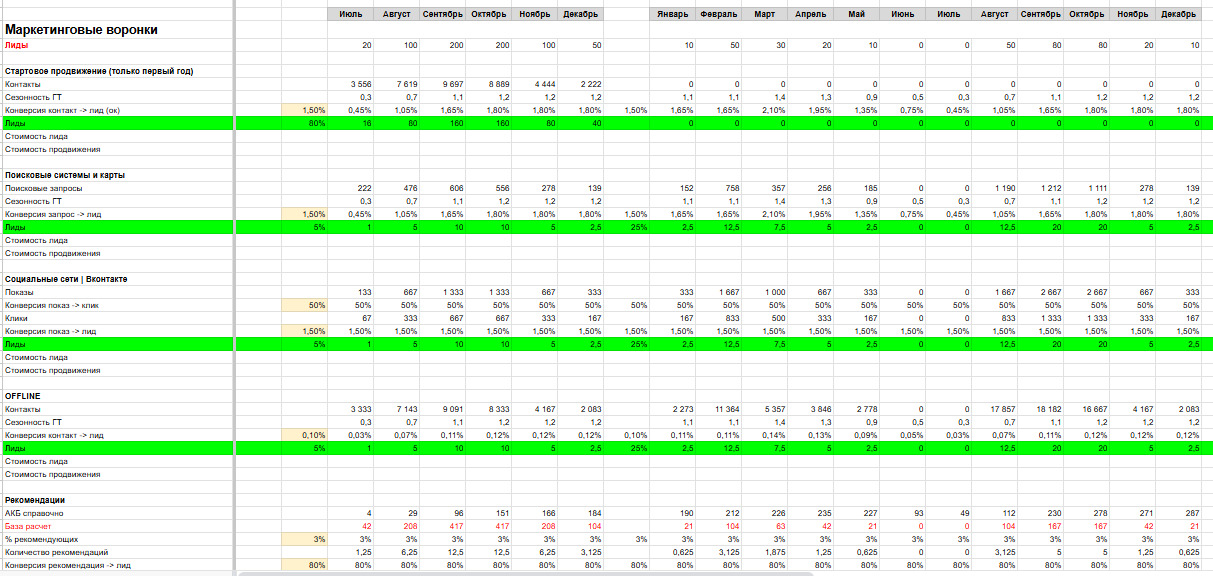 Вот как выглядели маркетинговые воронки в финмодели ↓