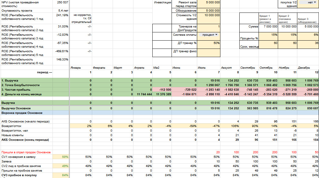 Поскольку новый зал располагался не в самом прибыльном районе, финдир сосредоточилась на расчёте предполагаемой выручки. Она учла все риски, построила воронки для привлечения клиентов и посчитала, сколько людей могут стать клиентами спортшколы в будущем.