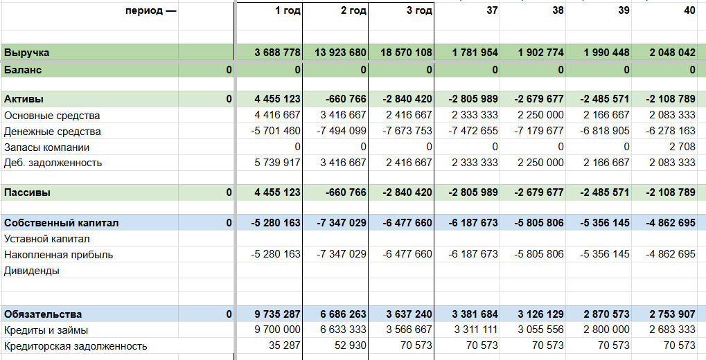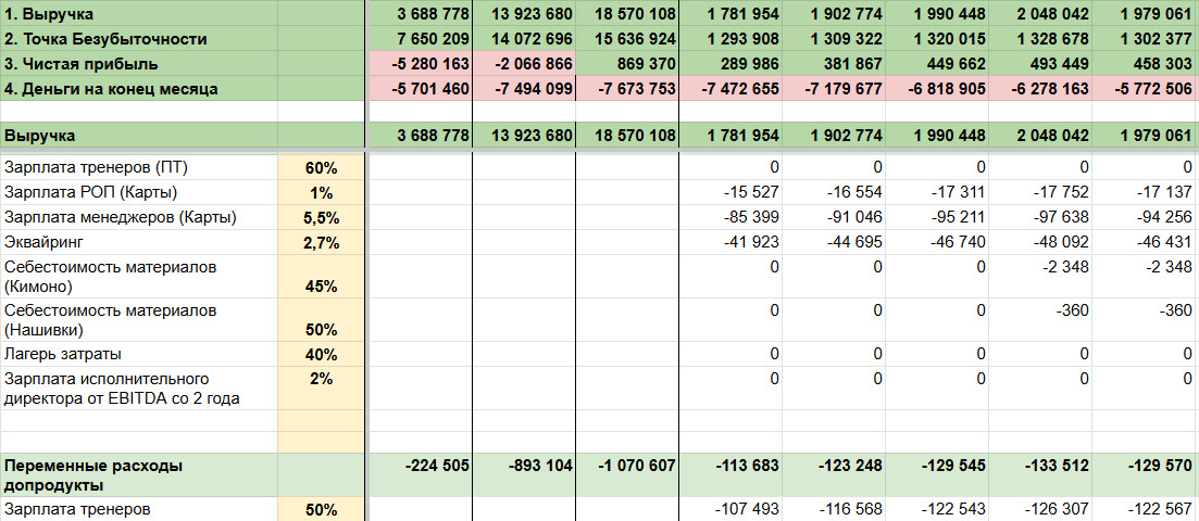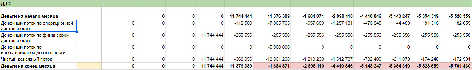 Общие расчёты в финмодели выглядели не совсем позитивно. Можно сразу заметить, что чистая прибыль надолго задержится в минусе, — это первый тревожный знак ↓