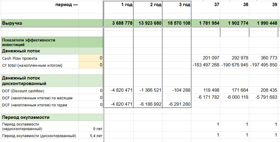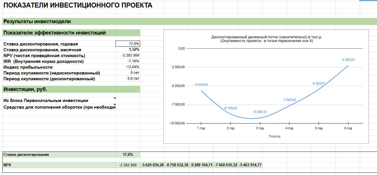 Дальше перешли к показателям эффективности инвестиций. Их значения должны были показать, стоит идти в проект или нет. Увидели, что с кэш-флоу проекта будут проблемы, плюс значения NVP и IRR были не такими радужными, но об этом дальше ↓