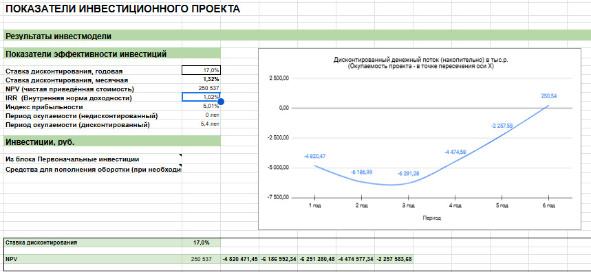 NPV становится выше нуля только на 6-м году от старта проекта. IRR порядка 1% годовых, поэтому необходимо усовершенствовать сценарий до приемлемых значений.