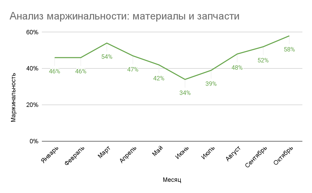 Финансовый директор просчитала на финмодели, насколько выгодно будет купить установку для самостоятельной колеровки краски. В итоге оборудование приобрели, и после этого маржинальность по материалам выросла до 58% ↓