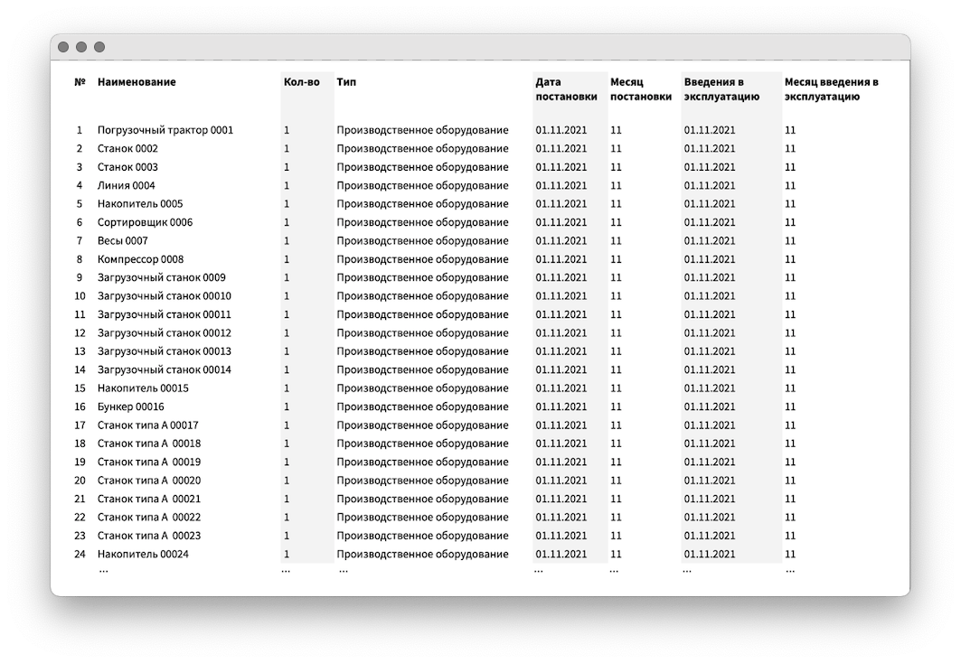 Чтобы не запутаться, какое оборудование ремонтировали, а какое нет, мы каждую единицу записали отдельно с инвентарным номером. Например, «Станок типа А 0032» и «Станок типа А 0033», а не два станка типа А.