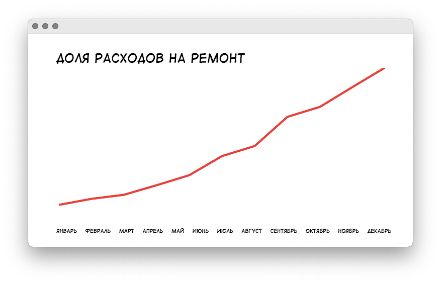 И всё вроде было хорошо: работаем, живем. Но в последнее время на ремонт стало уходить всё больше и больше денег: тут нужно двигатель заменить, здесь — поменять шестерни, там — еще что-то. И компания стала замечать, что с каждым месяцем статья расходов на ремонт растёт всё сильнее, условно так:
