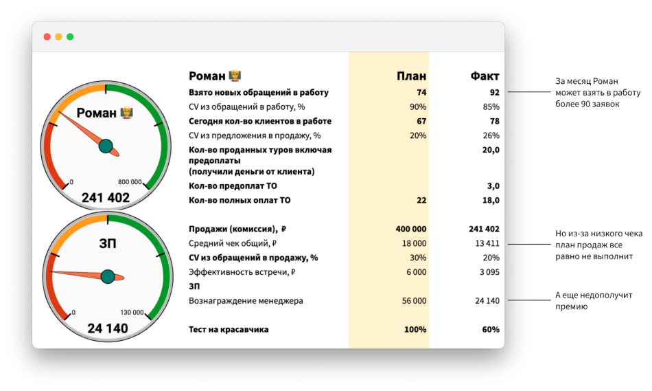 Или, например, Роман мог брать много сделок и хорошо их обрабатывать, но все равно получать мало выручки. Все потому, что он боялся предлагать клиентам дорогие туры. Мы показали, что можно выполнять план меньшими усилиями: продавать не 20 дешевых туров, а 10 дорогих. Когда Роман на этом сфокусировался, то увеличил средний чек и заодно выручку компании.