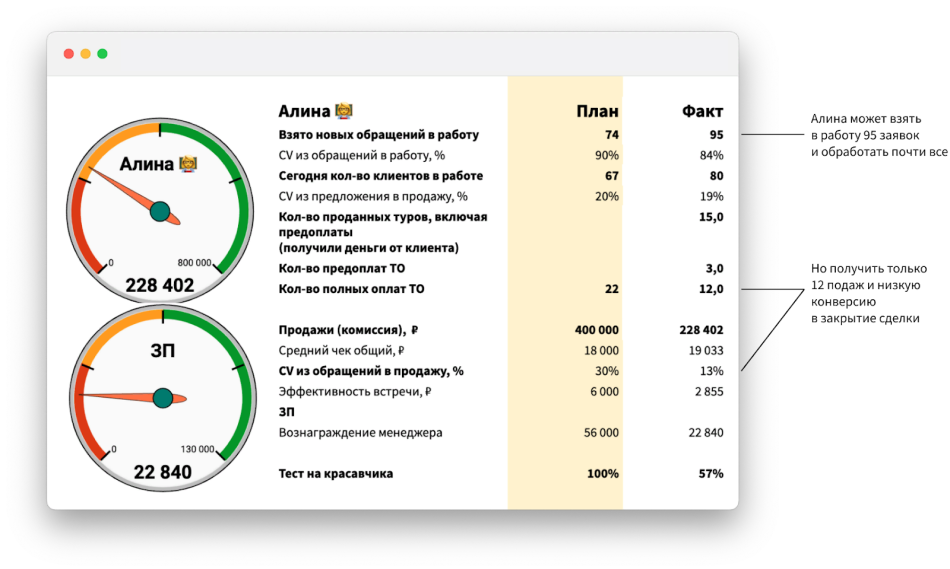 Например, Алина могла взять в работу много обращений и все обработать — это ее сильная сторона. Слабая была в том, что она забывала отправлять клиентам ссылки на предоплату в мессенджер, и люди не доходили до закрытия сделки. Руководитель увидел это в отчете, обсудил ситуацию с продавцом, и через месяц конверсия в предоплату выросла.