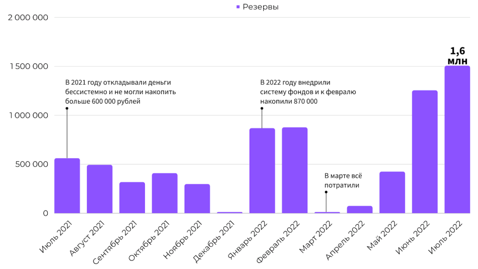 Когда мы начали работать в мае 2021 года, то сразу стали откладывать деньги. Правда, у нас еще не было отчетов и статистики, поэтому мы копили бессистемно. Могли — откладывали побольше, не могли — не откладывали совсем. Если бизнесу нужны были деньги, собственник мог вытянуть из резервов пару сотен тысяч рублей.