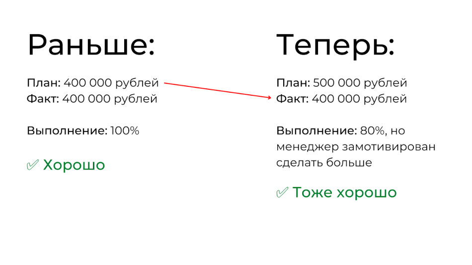Мы посмотрели, сколько менеджер обычно зарабатывает выручки. Например, если он стабильно делал 400 000 рублей в месяц, считали это как 80% от плана. Соответственно, новую планку в 100% ставили на 500 000.