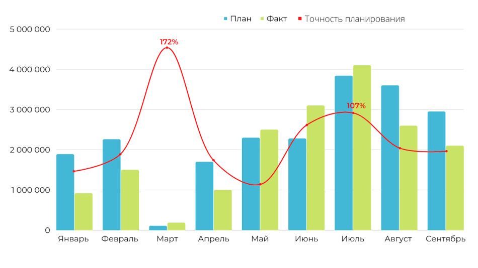 Корректировать план продаж. Операционный отчет помог нам контролировать выручку. Например, мы видели, что менеджер заболел и две недели не будет выполнять план. Мы могли попросить другого сотрудника обработать больше заявок или снизить план, чтобы сохранить точность планирования. Так в июле мы вышли на точность планирования в 107%.