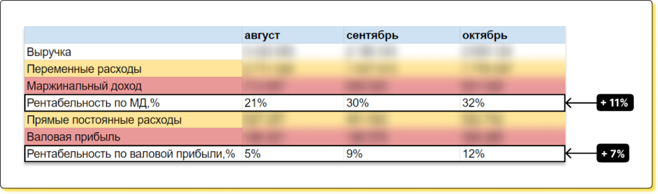 ↑ Рентабельность по валовой прибыли выросла с 5% до 12%, а по маржинальному доходу с 21% до 32%