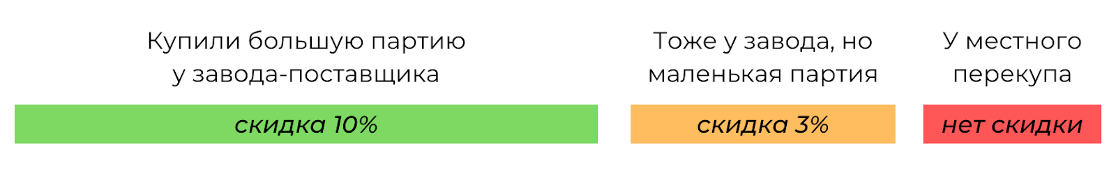 Большие партии деталей поставляли оптовики с хорошей скидкой, но так как собственник не всегда знал, сколько именно нужно закупить, одной поставки как правило не хватало. Поэтому собственник начинал кусочничать: брал партии поменьше с меньшей скидкой и даже перекупал комплектующие у местных втридорога:
