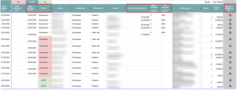 Вот как выглядит лист учета сделок для зуботехнических лабораторий: