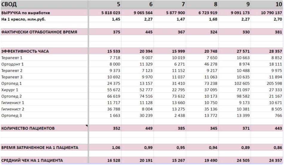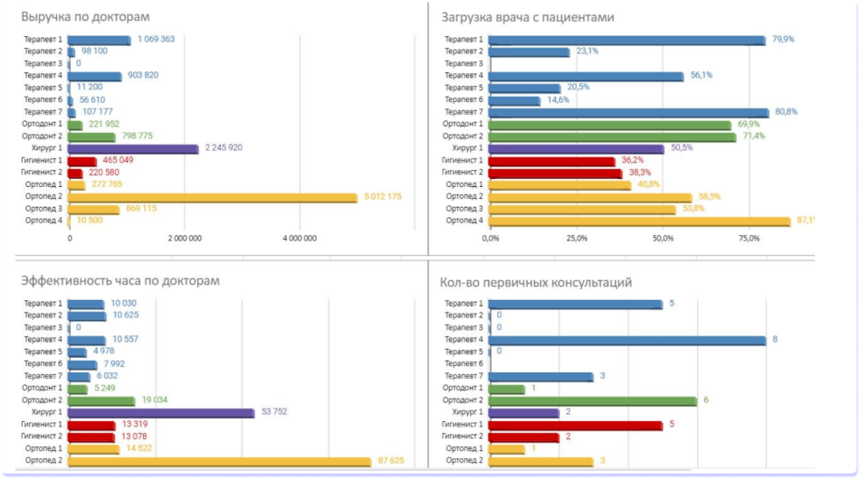 Так можно сравнивать специалистов одного направления между собой: терапевта с терапевтом, ортодонта с ортодонтом. Показатель помогает узнать, сколько выручки приносит каждый врач за час работы с пациентом.