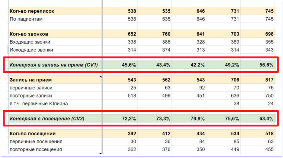 Администраторы стали вести отчет каждый день, а финдир — анализировать конверсию в запись на прием и в посещение: