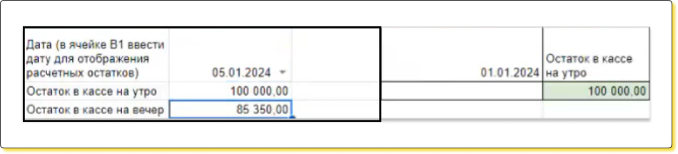 Под конец дня администратор может выбрать в таблице текущую дату и сверить остатки — данные по деньгам в кассе на утро и вечер подтянутся автоматически ↓
