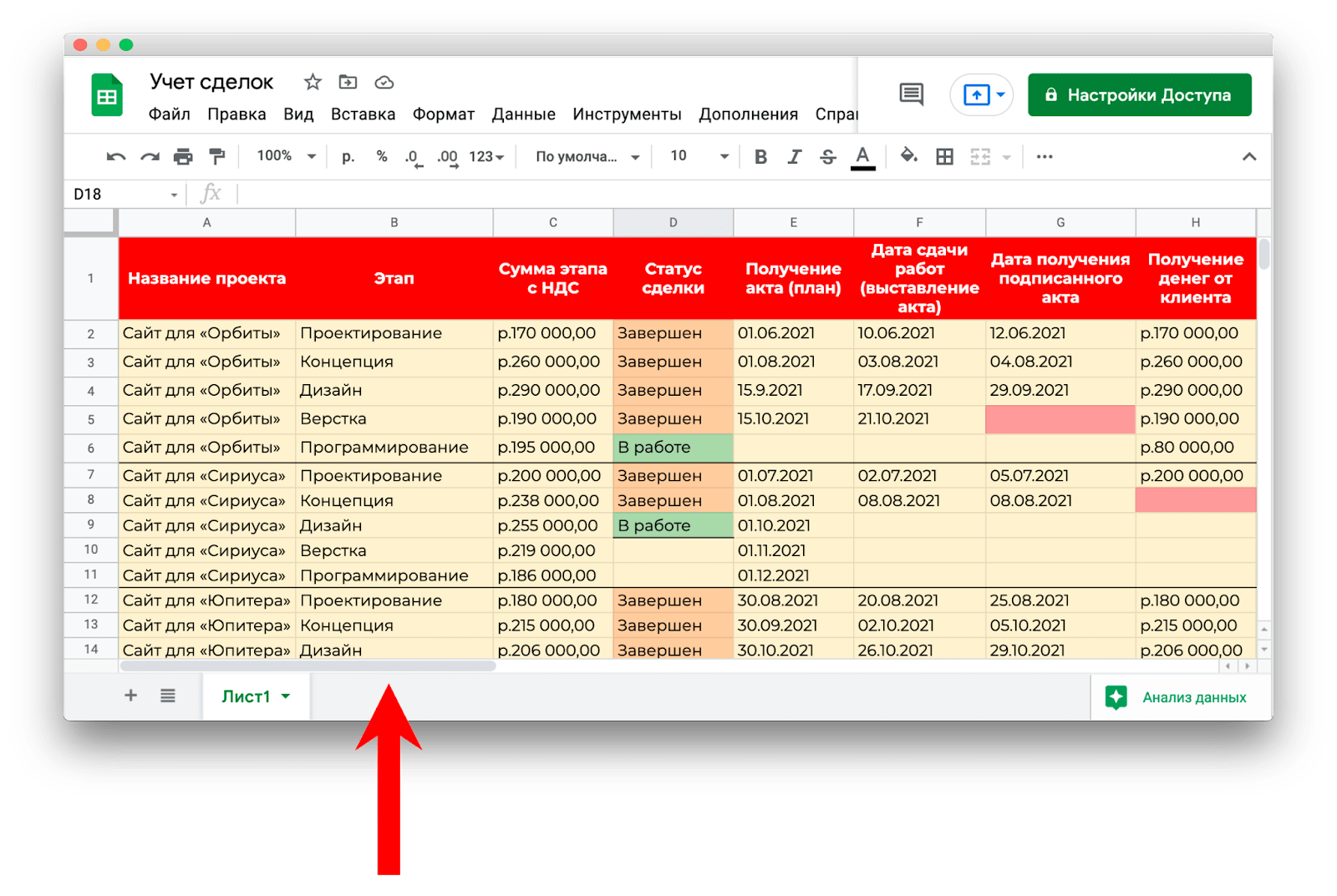 Чтобы узнать выручку «Тьюринга», я завела лист учета сделок — это такая табличка, которая показывает, какие сделки завершены, а какие нет, сколько денег потрачено и заработано на каждом проекте.