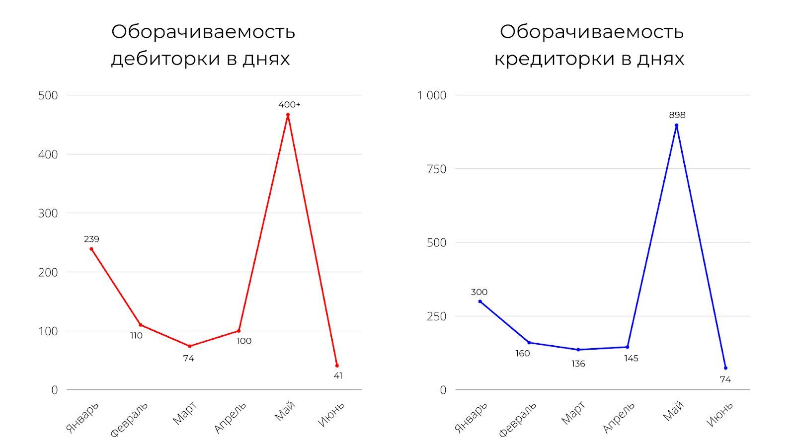 В мае с крупным клиентом случилась совсем плохая история. Он не подписал акт на 1,5 млн рублей, на которые «Тьюринг» рассчитывал. В итоге дебиторка поползла вверх, а оборачиваемость выросла, хотя мы старательно тянули ее вниз: